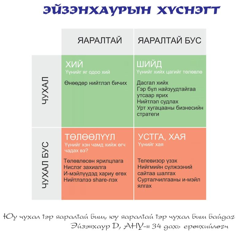 Ямар ч завгүй явдаг боловч бүтээсэн юм байдаггүй хүмүүс байдаг. Энэ бол цагаа сайн зохицуулж чадахгүй байгаагийг илрэл юм. Бид бүх зүйлийг 24 цаг дотор багтаан гүйцэтгэж чадахгүй учраас хийх ажлаа чухал болон яаралтай гэж ангилах хэрэгтэй юм. АНУ-ын цэргийн генерал, хожмын ерөнхийлөгч Эйзэнхаур цаг ашиглалтын талаар маш оновчтой хүснэгт гаргасан байдаг. Бид ямар нэг зүйлийг хийж эхлэхдээ хийх гэж буй зүйл маань чухал уу? яаралтай юу гэсэн 2 асуултыг тавих хэрэгтэй юм.